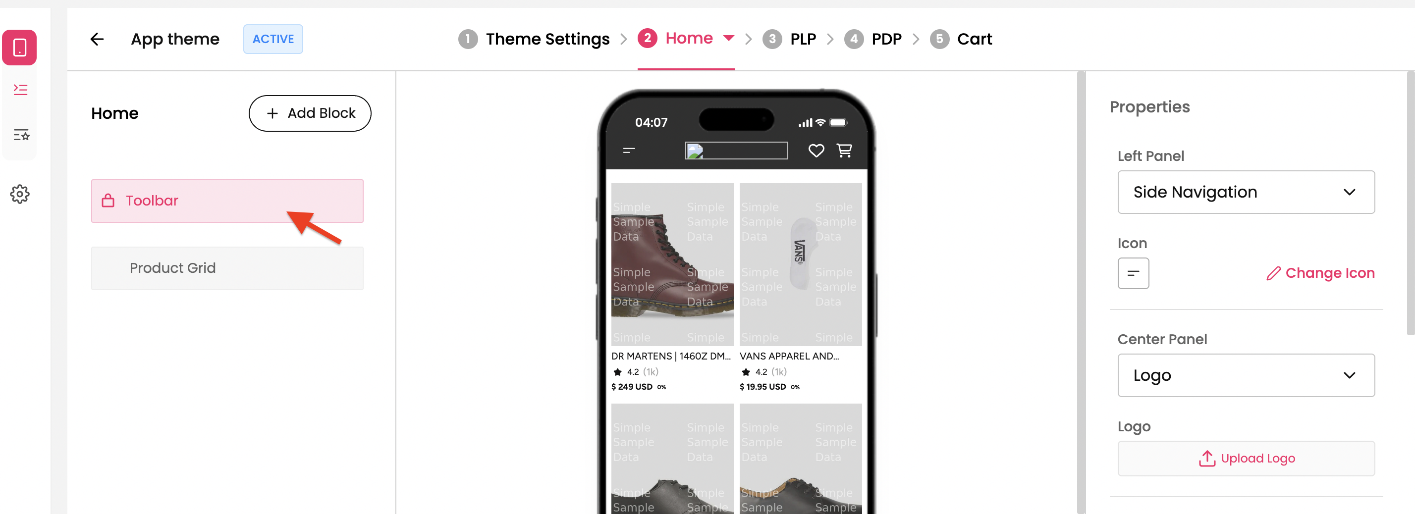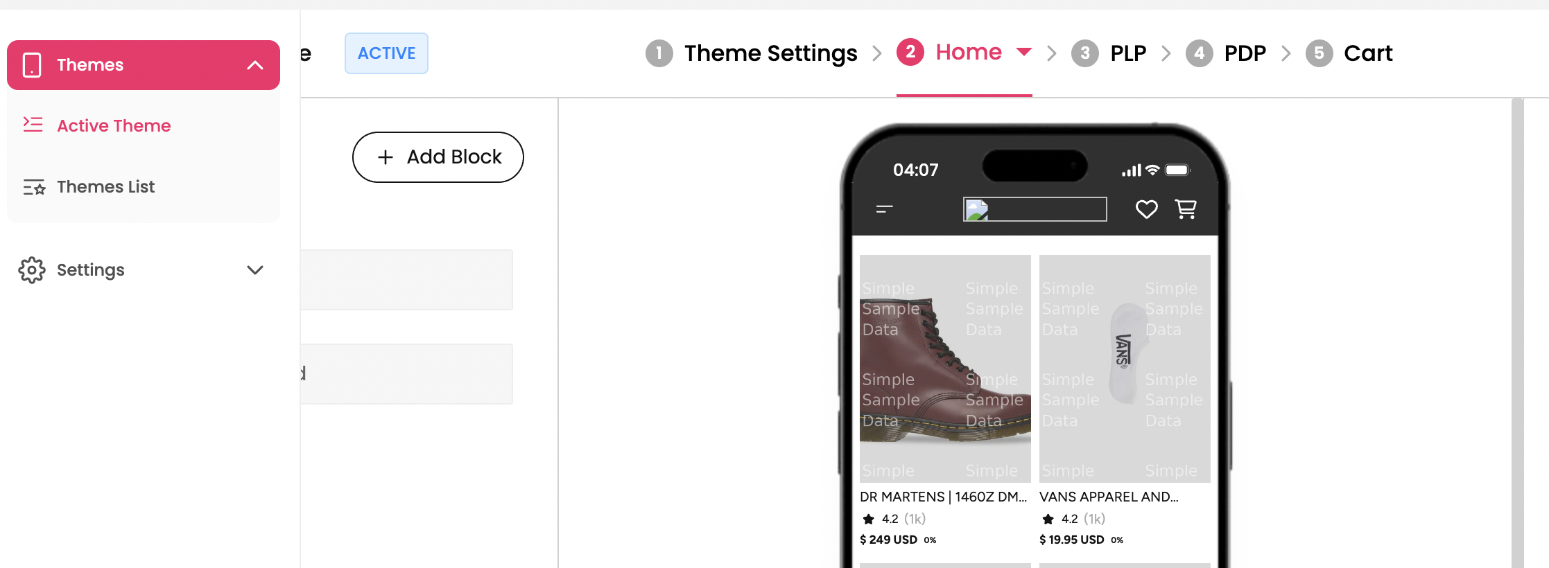 Step 1 : Navigate to the “Active Theme” section of the Dashboard. You’ll be navigated to the “Home” Page section of the app.
