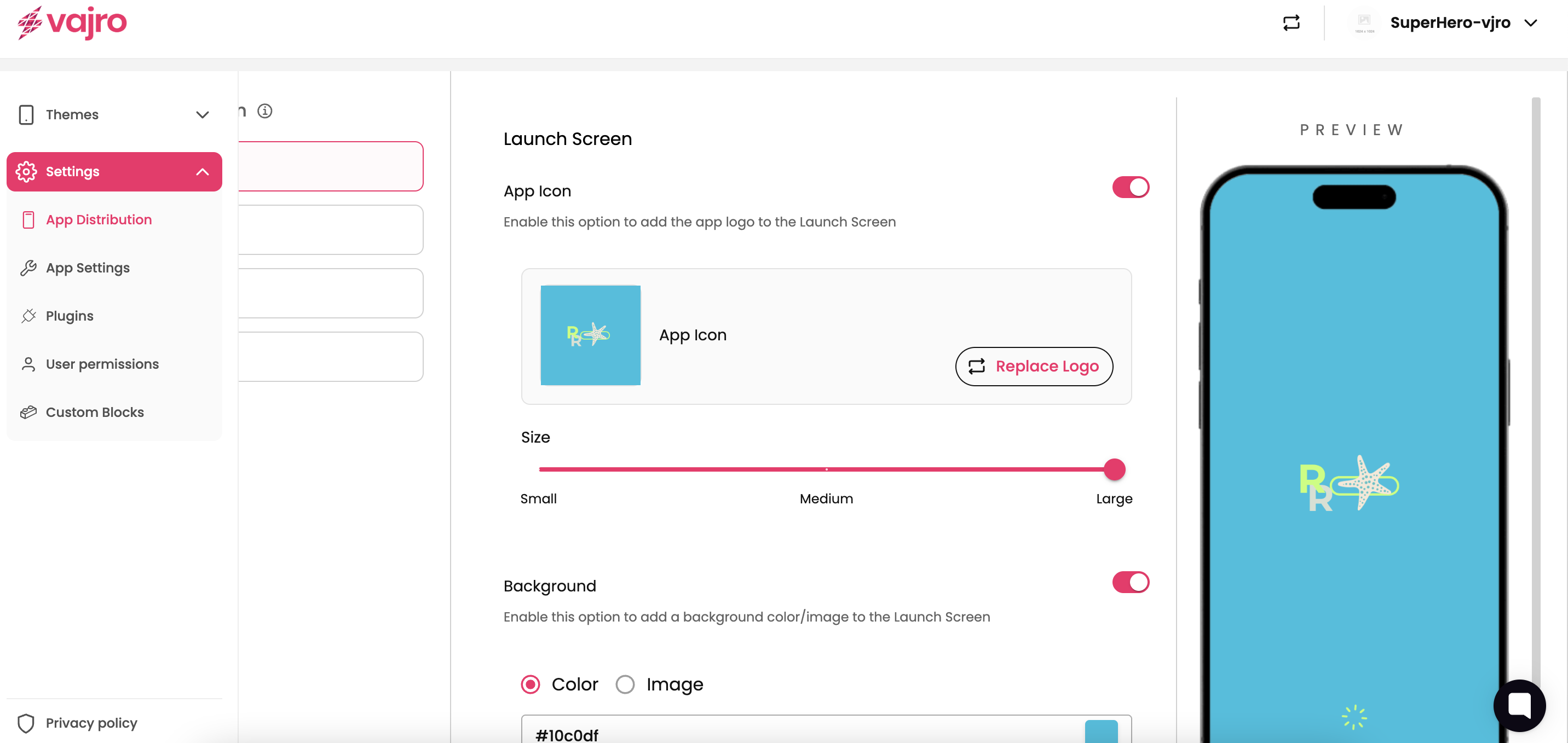 Step 1 : Navigate to the “Launch Screen” section of the dashboard by clicking on Setting → App Distribution. (The Launch Screen is the very first menu of the App Distribution).