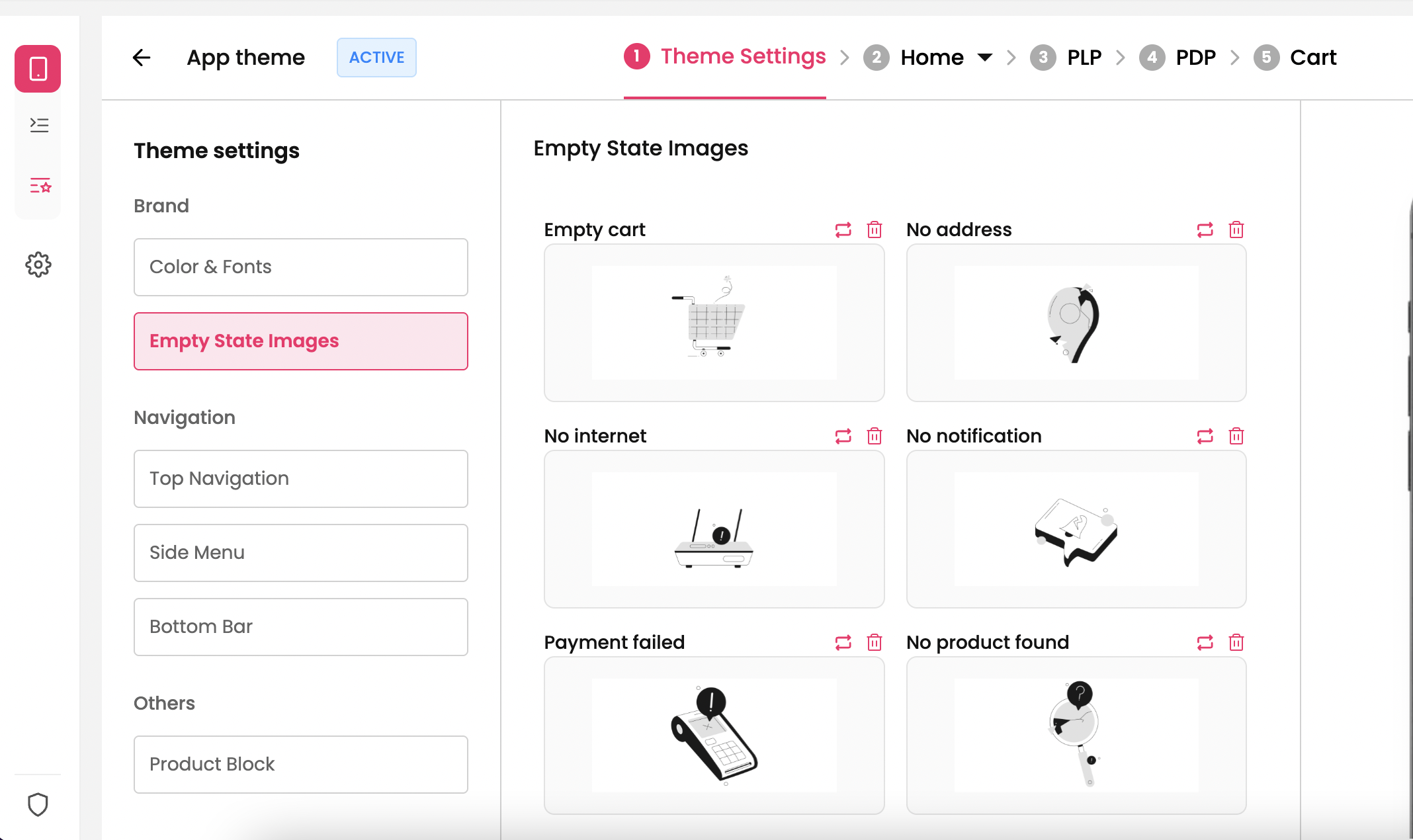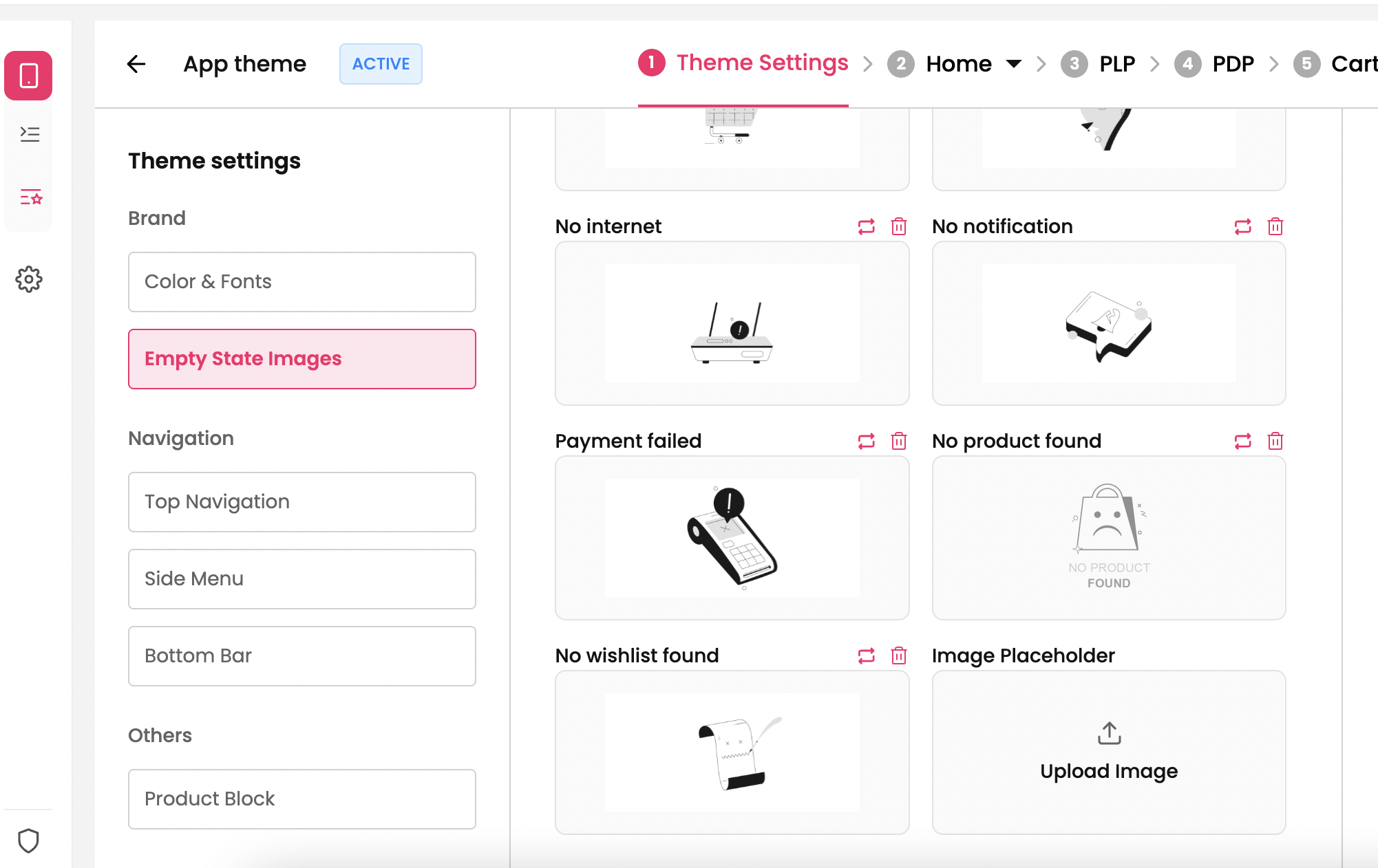Step 2 : On the Left Side menu, under the “Brand” section, there is an menu which says “Empty State Images”. Click on that and you’ll get navigated to that page where you can upload the images for different states.