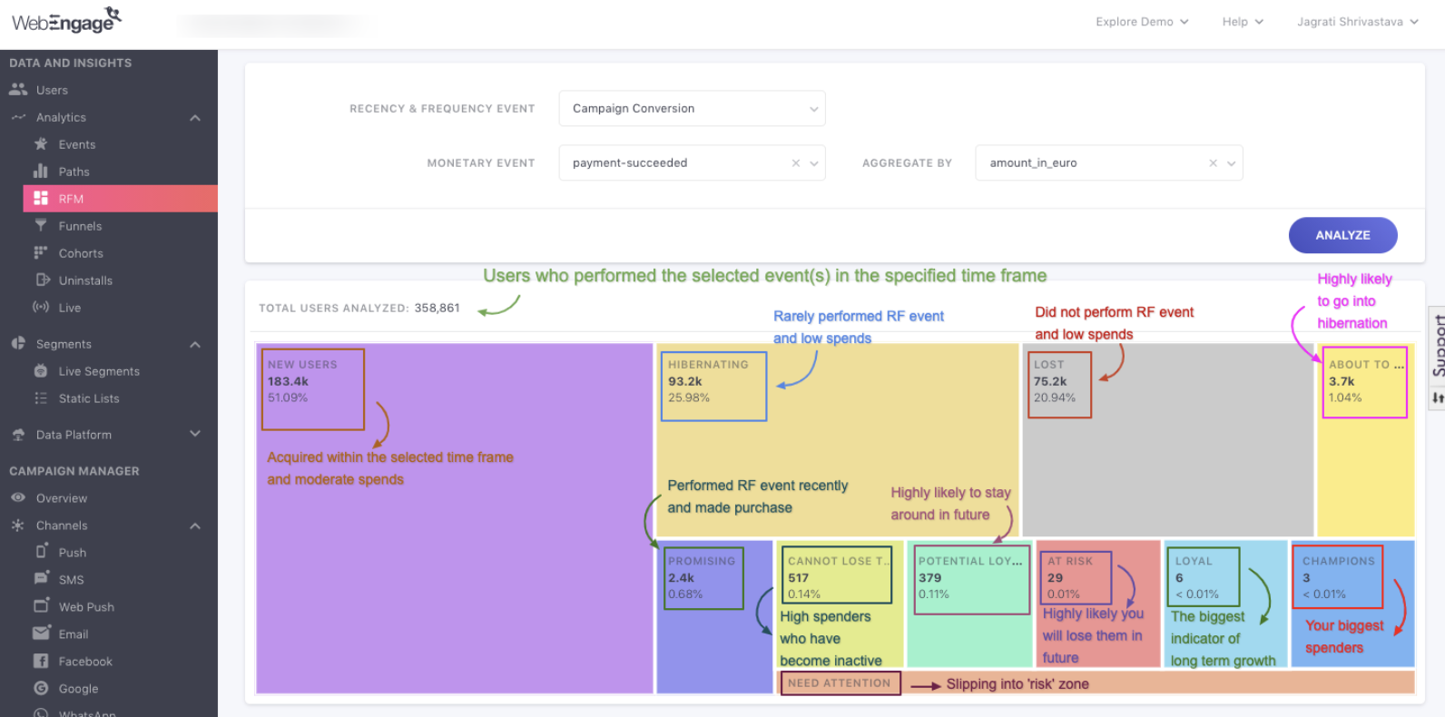 WebEngage uses AI-driven predictive segmentation to score users from 1 to 5 on each parameter and group them into 11 RFM segments.