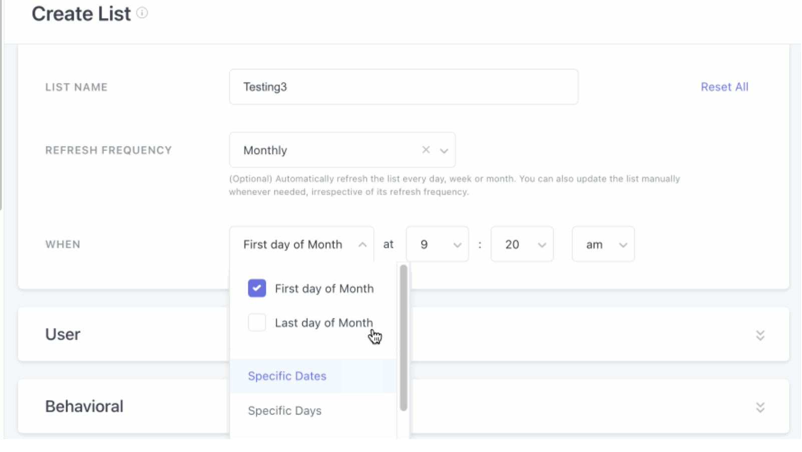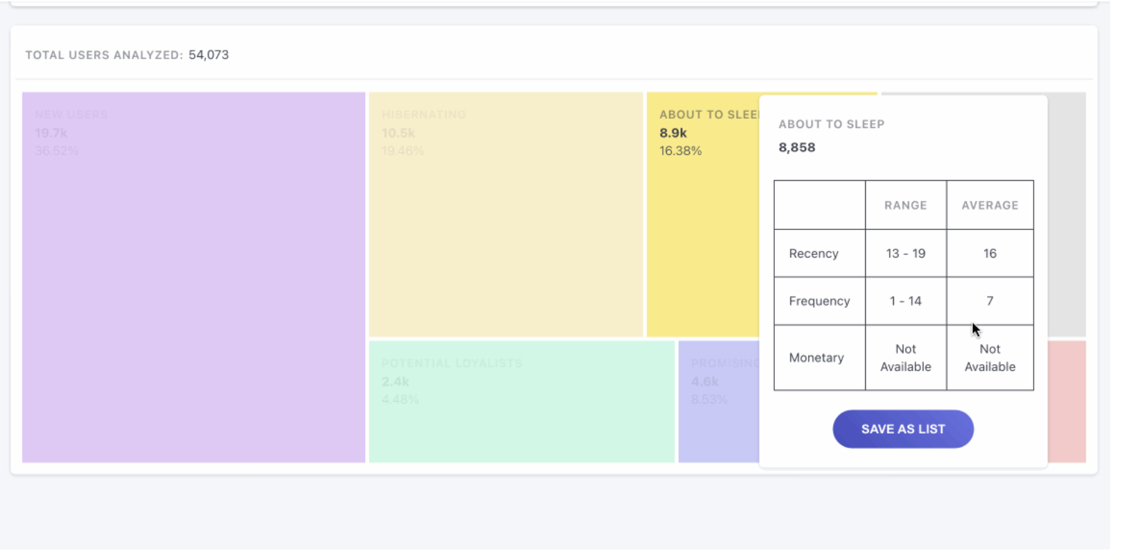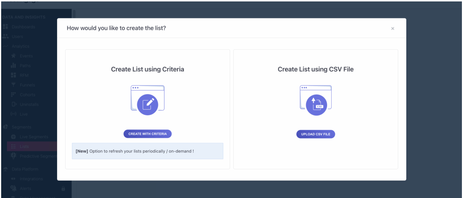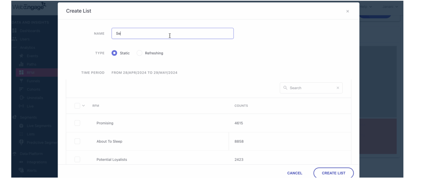 Segmentation in WebEngage helps you group users based on attributes, behaviors, and predicted intent. You can create and analyze user groups as Lists, Refreshing Lists, Live Segments, RFM Segments, and Predictive Segments.