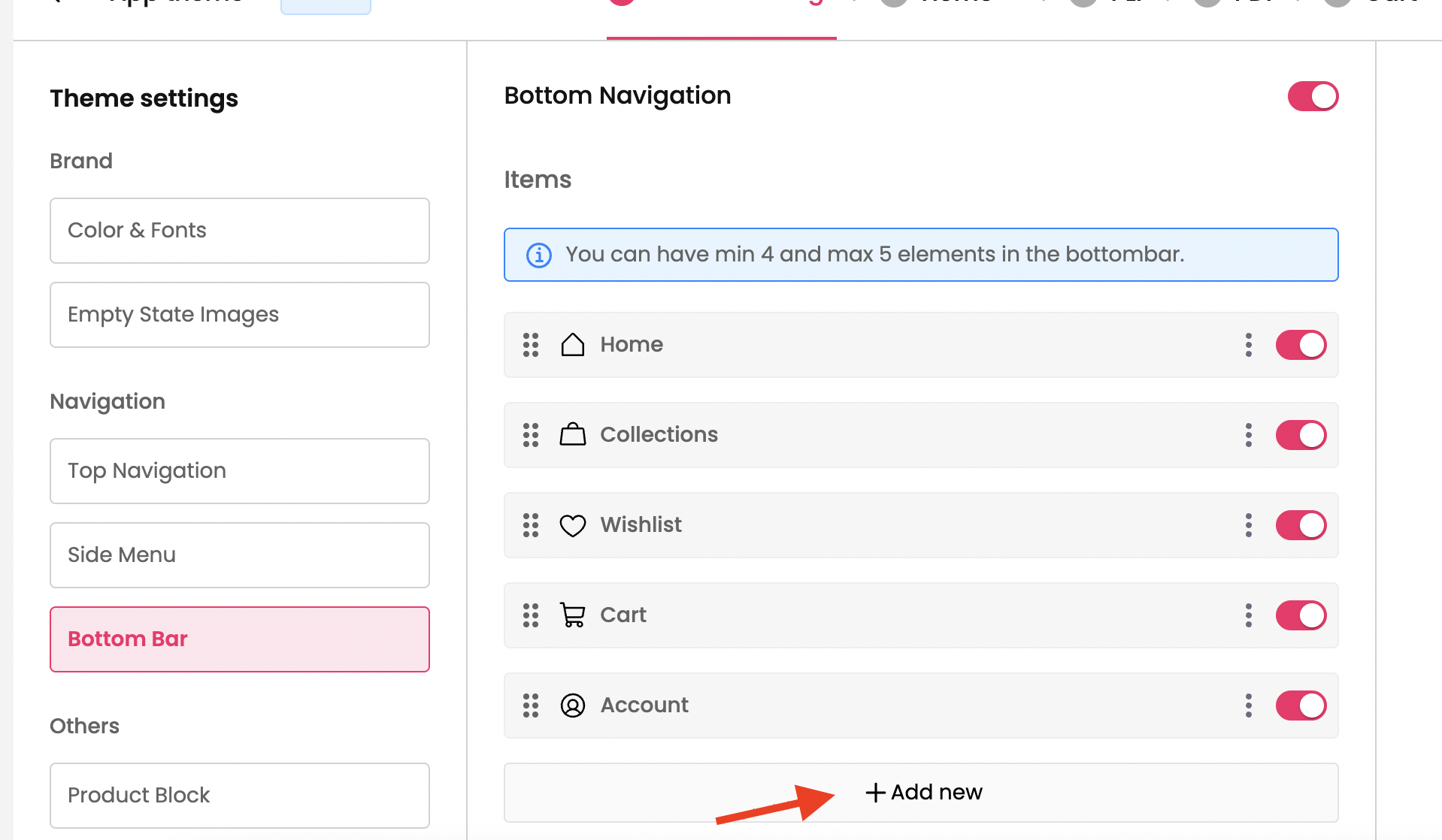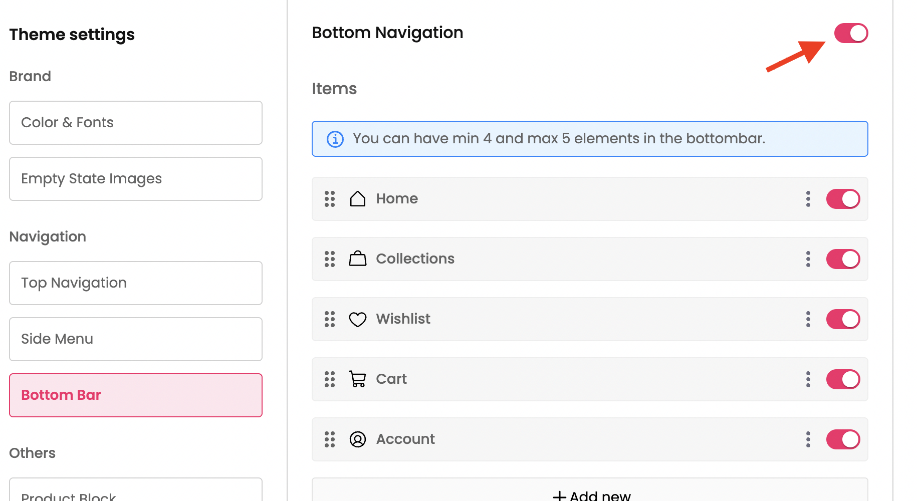 Step 3 : Toggle the Bottom Navigation switch ON (top-right of the Bottom Bar panel) to enable the feature.