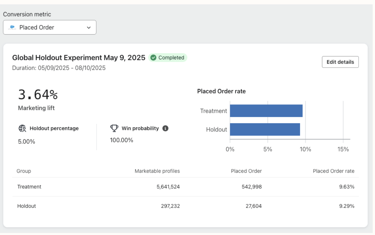 Marketing lift: Shows the impact of your marketing vs. the holdout group
