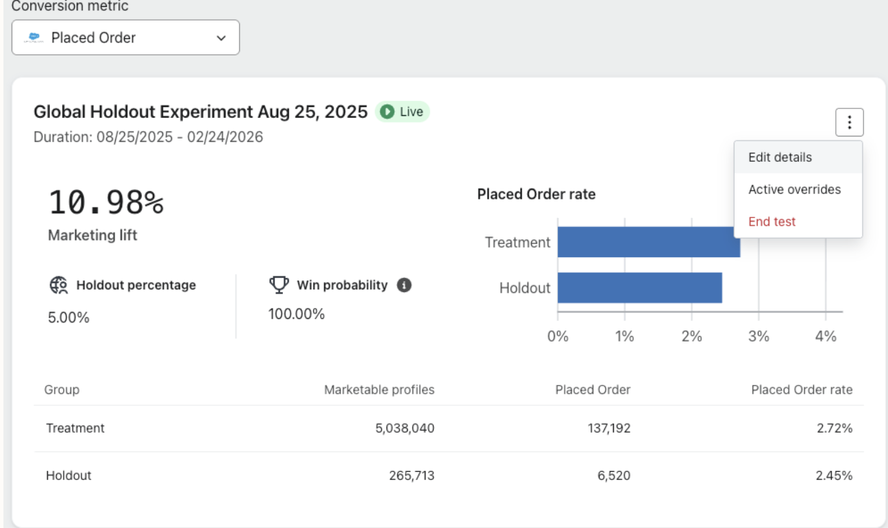 Klaviyo provides tools to measure the effectiveness of your marketing campaigns through A/B testing and global holdout groups. This guide walks you through navigating, configuring, and interpreting these insights.