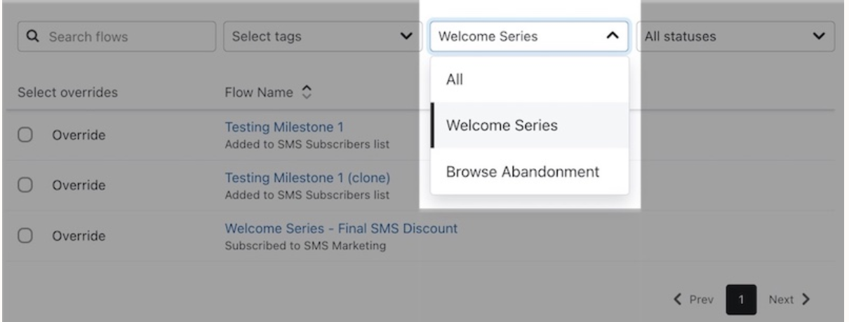 Switch between Campaigns and Flows tabs to see tests for each channel.