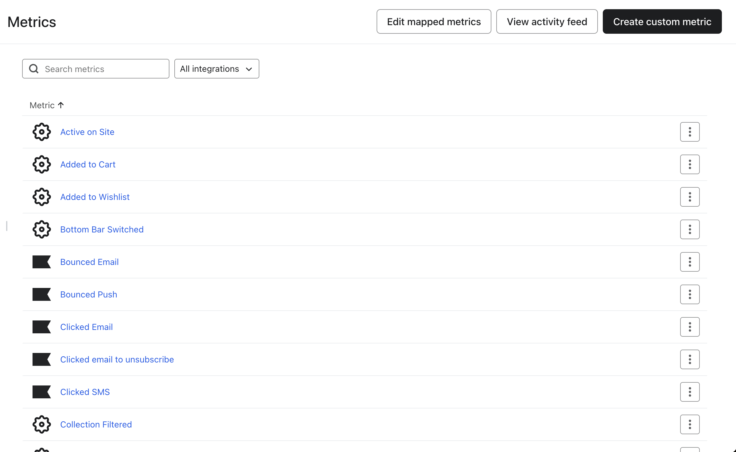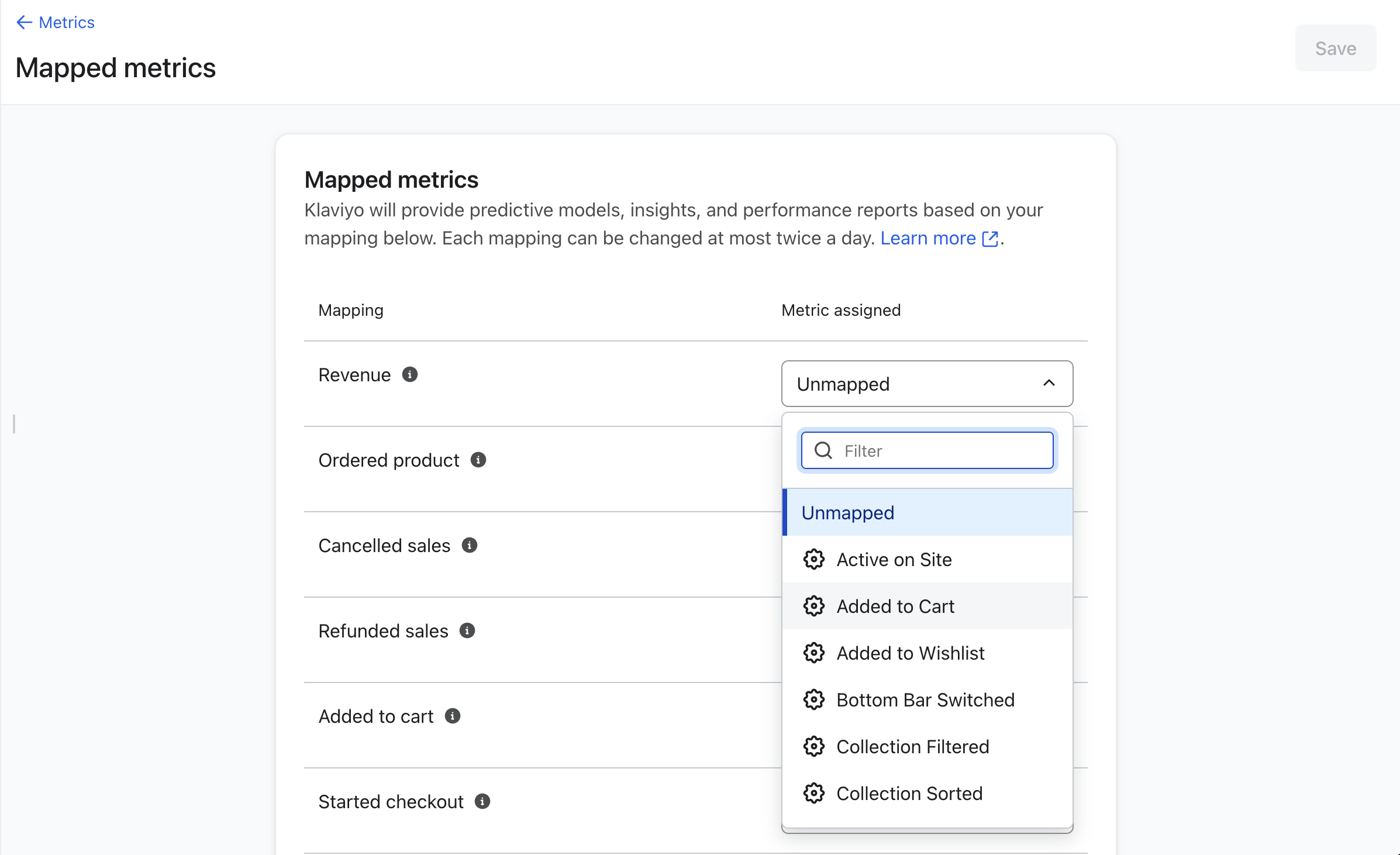 Mapped metrics connect your custom events to Klaviyo’s standard behavior categories, enabling predictive models, revenue tracking, and standardized reporting. These mappings ensure that Klaviyo understands what your custom events represent (e.g., "Purchased" = Revenue).