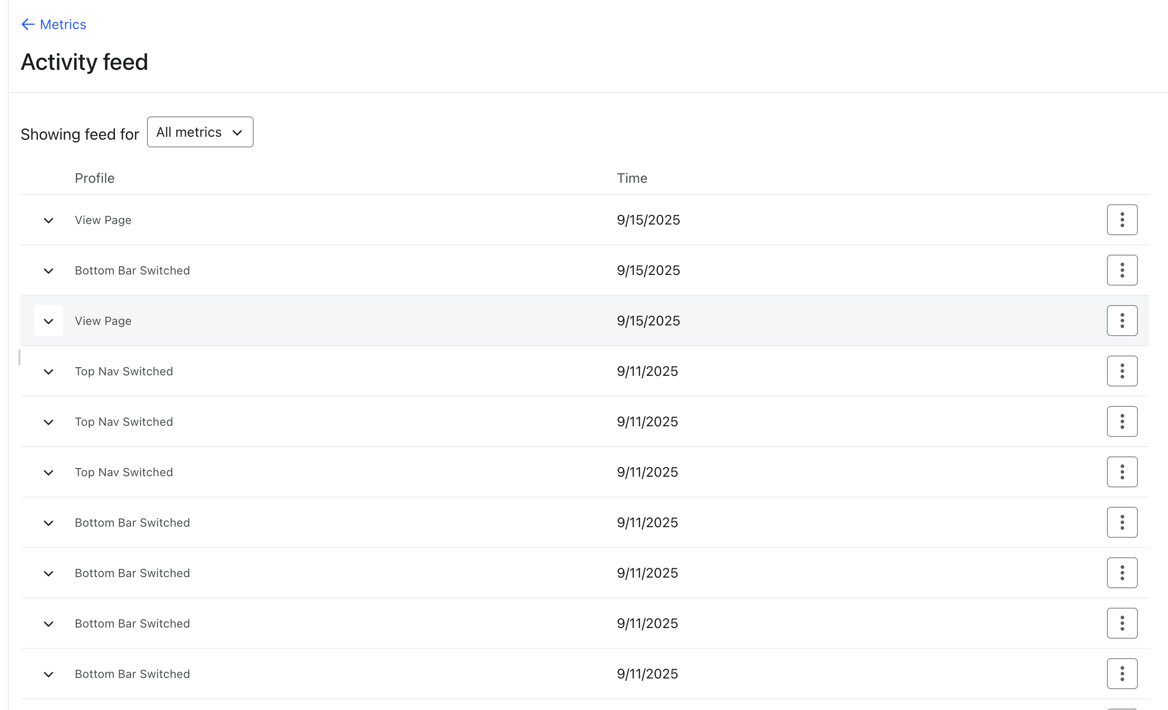 You can use the dropdown menu to filter the feed by a specific metric, and you can click the arrow next to any event to view more details.